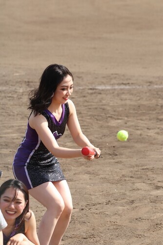5回終了時のイベントでバント職人にチャレンジするMiramさん。